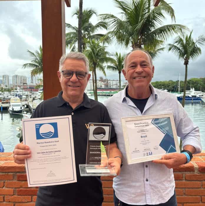 Florianópolis (SC) – 03 de novembro de 2025 – O Iate Clube de Santa Catarina (ICSC) – Veleiros da Ilha alcançou uma marca histórica ao receber, pelo décimo ano consecutivo, a certificação Bandeira Azul para a Sede Central. A cerimônia da temporada 2025/2026 foi realizada nesta sexta-feira, 31 de outubro, no Iate Clube Santos – Sede Guarujá (SP), e contou com a presença do Comodoro Ildefonso Witoslawski Junior e do Diretor Financeiro Saul Capella, que representaram o Clube no evento.