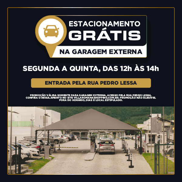 Os clientes que visitam o Villa Romana Shopping no horário do almoço têm mais comodidade: a liberação do estacionamento na garagem externa, localizada na Rua Pedro Lessa, de segunda a quinta-feira, das 12h às 14h. A ação vale também para feriados e segue até 31 de maio. O desconto é aplicado automaticamente, sem necessidade de validação nos guichês.
