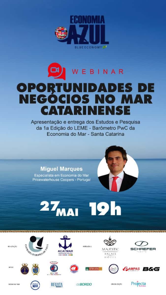 O evento será nesta quarta-feira (27), às 19h, e faria parte do Simpósio Internacional Economia Azul, transferido para 14 de abril de 2021 em virtude da pandemia de Covid-19. Realizado pela Confraria Náutica Europeia e Associação Náutica Brasileira (Acatmar), o webinar terá o tema ‘Oportunidades de negócios no mar Catarinense’ e contará com o português Miguel Marques, auditor e consultor da Pricewaterhouse Coopers (PwC) e especialista em economia do mar. Ele apresentará um estudo realizado pelo Centro de Excelência da PwC, entregando à sociedade catarinense a primeira edição do LEME – Barômetro PwC da Economia do  Mar (Santa Catarina).